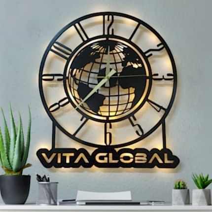 Dünya Haritası Tasarımlı Işıklı Şık Ofis Duvar Saati
