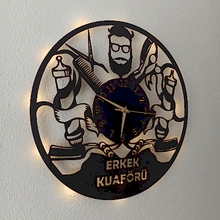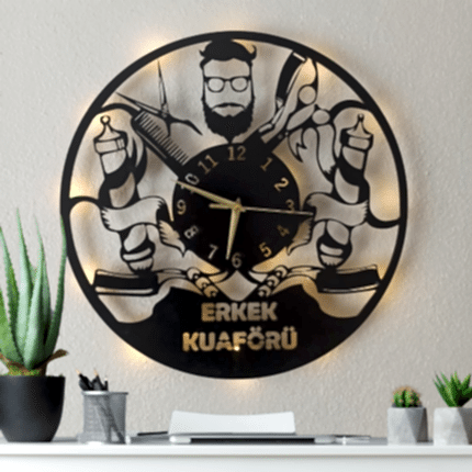 Erkek Kuaförü İçin İsim Yazılan Işıklı Kuaför Duvar Saati