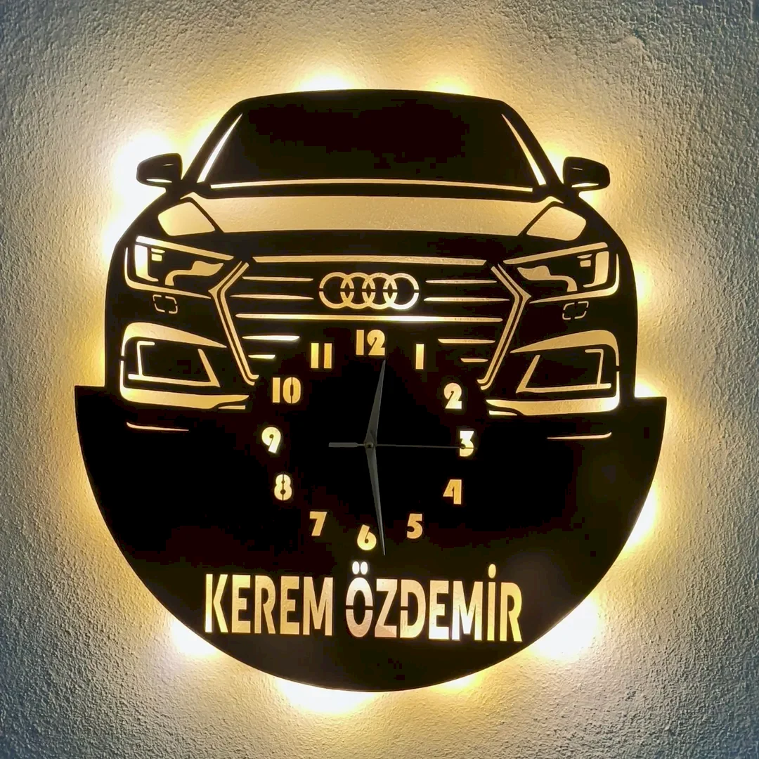 Audi tutkunları için 50 cm LED ışıklı dekoratif duvar saati. Şık, modern ve dikkat çekici tasarım.