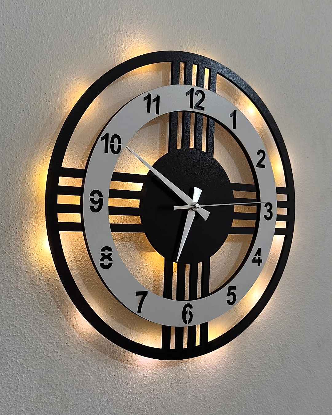 Beyaz çemberli 40 cm modern 4 çizgili tasarımı ve ışıklı yapısıyla dekoratif şık duvar saati.