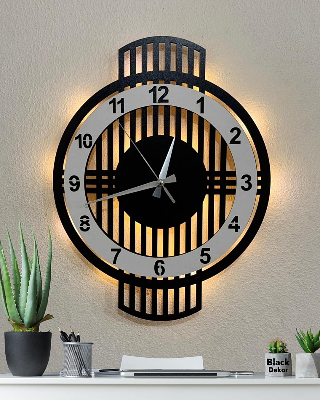 Beyaz Çemberli Işıklı Modern Izgara Desenli Şık Duvar Saati