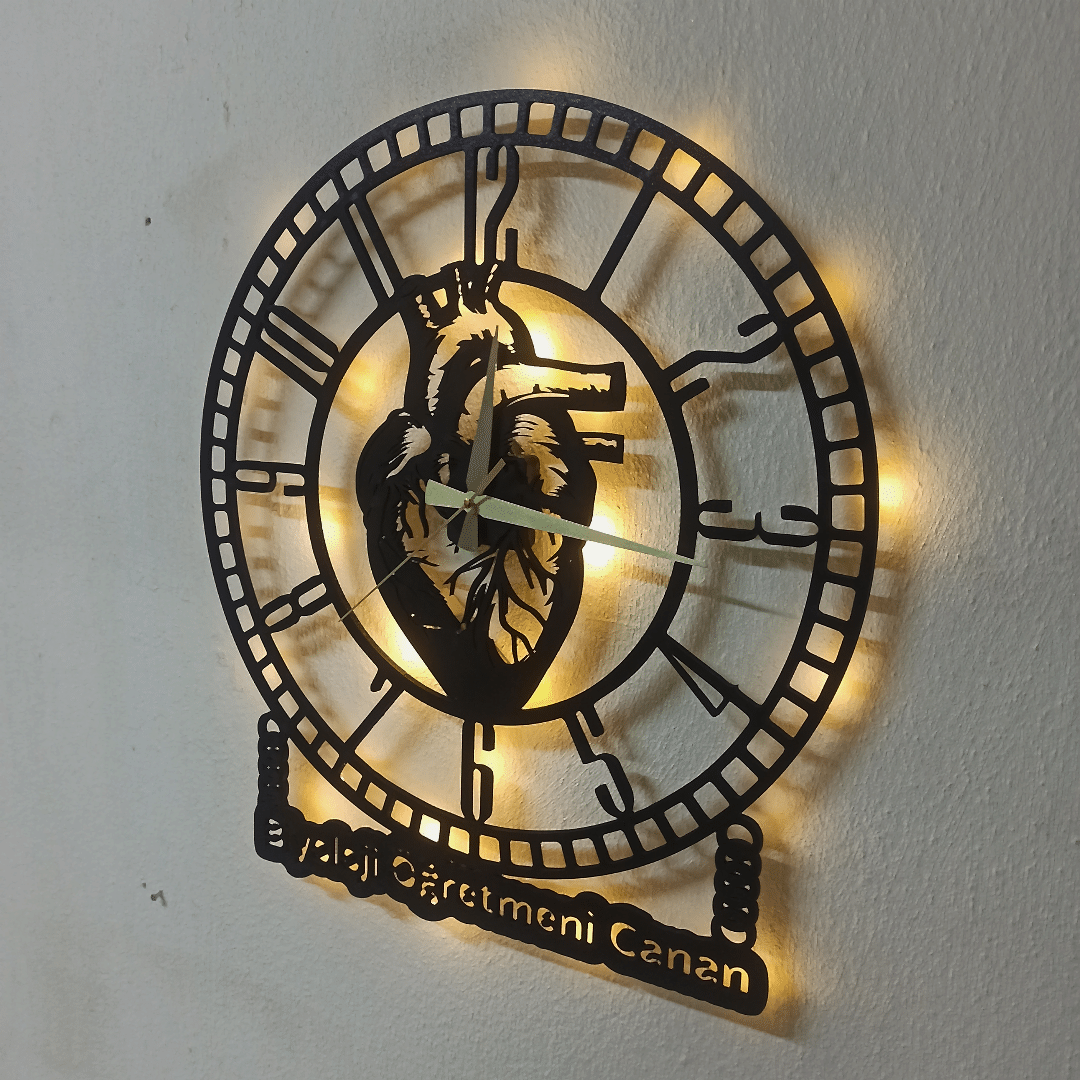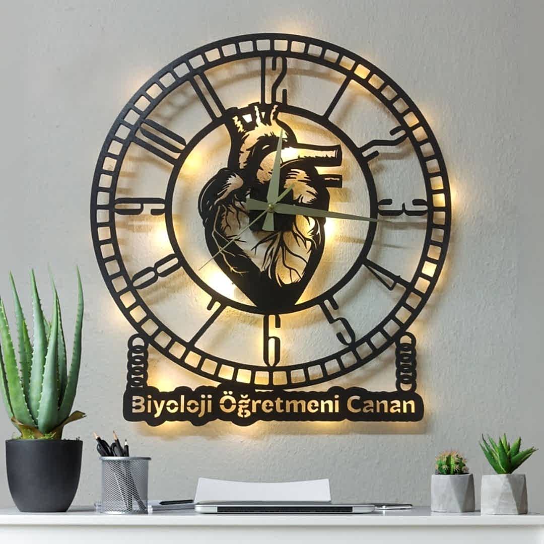 Biyoloji öğretmeni duvar saati, hediye duvar saati öğretmene, kalp figürlü duvar saati, kalp tasarım duvar saati, kişiselleştirilmiş duvar saati, kişiye özel öğretmen saati, LED ışıklı dekoratif saat, Modern duvar saati, öğretmenler için dekoratif saat, özel tasarım saat biyoloji, şık ve modern aydınlatmalı saat, tıp temalı duvar saati