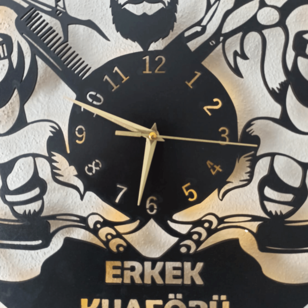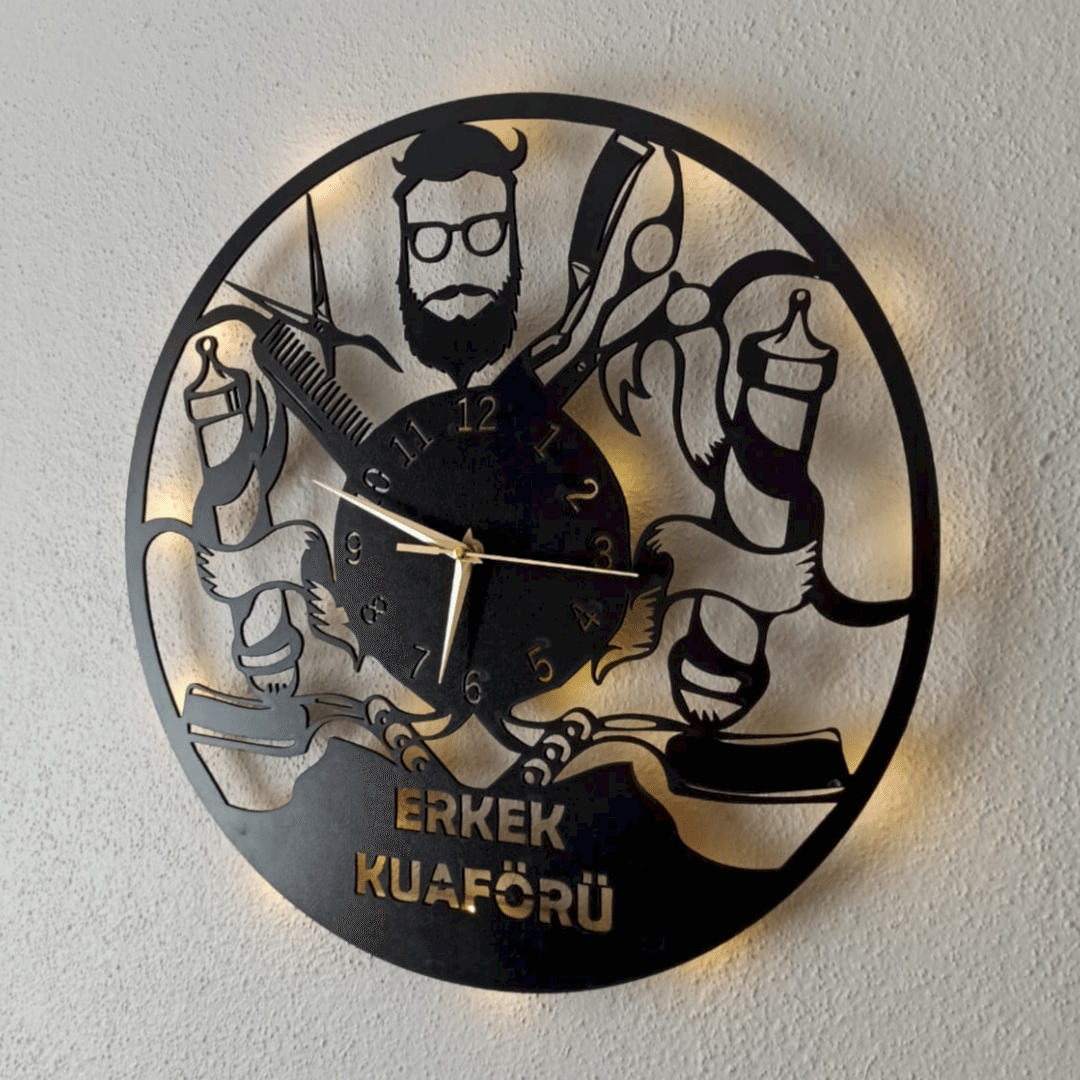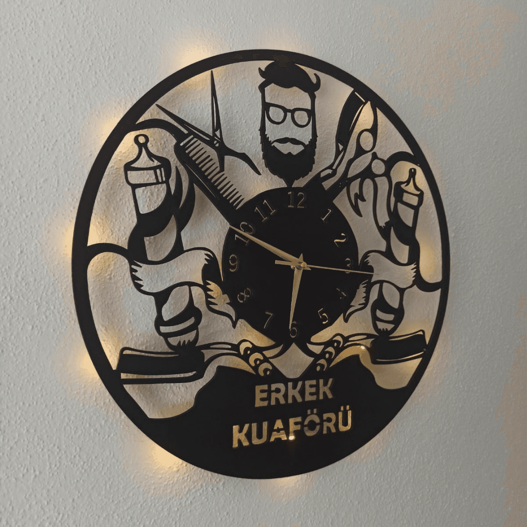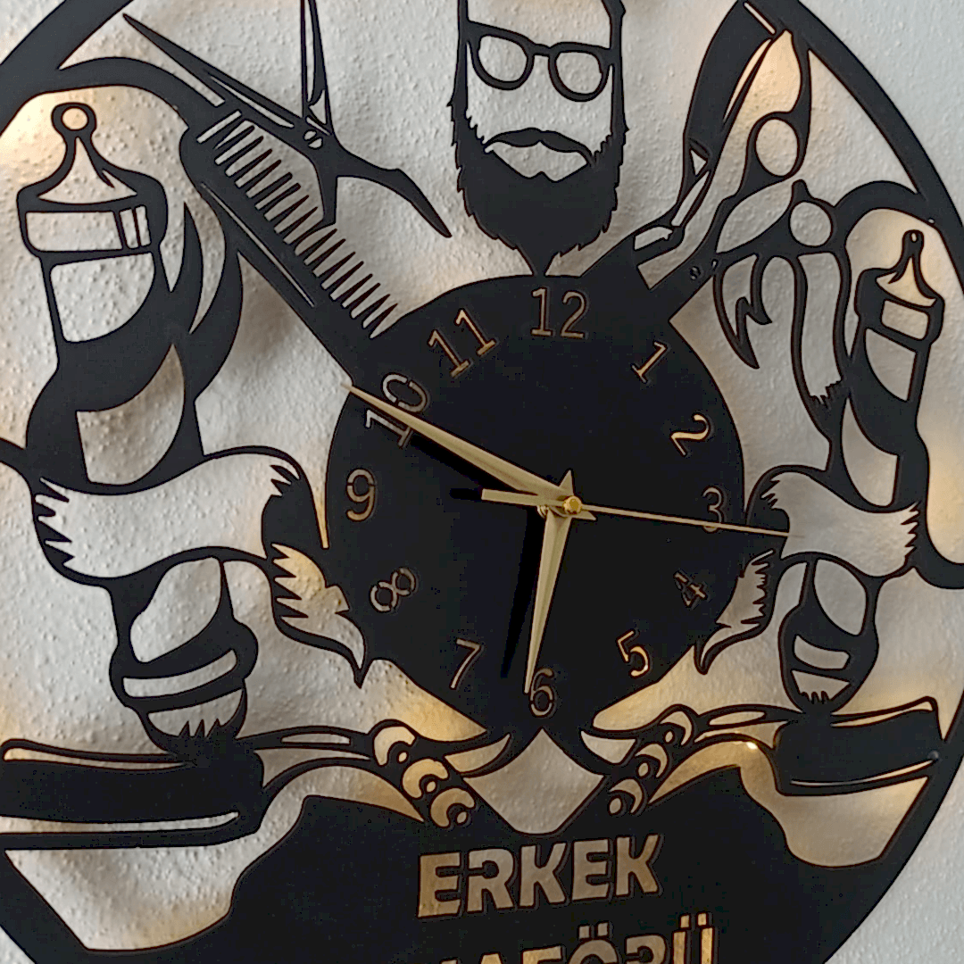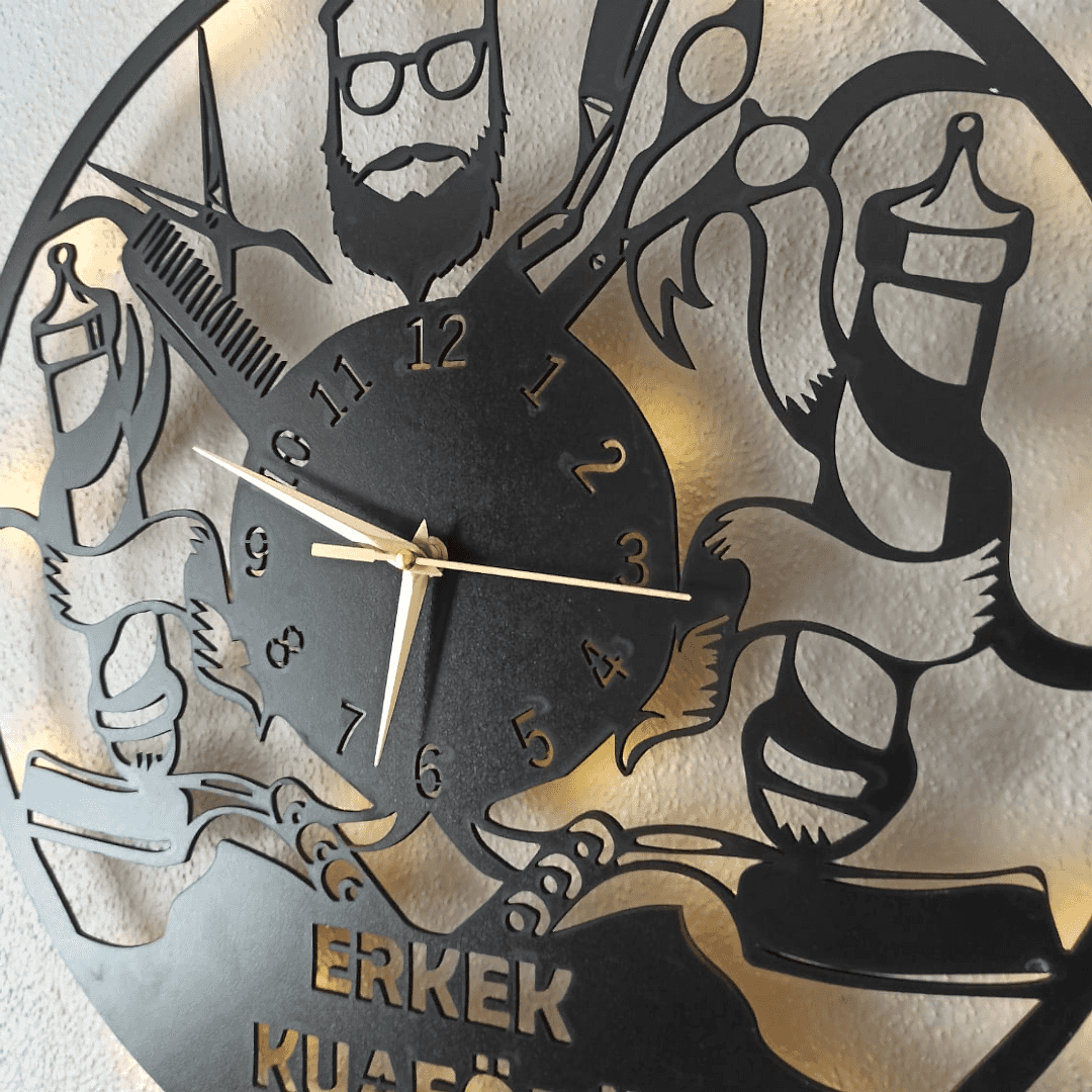 berber duvar saati, dekoratif saat, erkek kuaförü duvar saati, erkek kuaförü için saat, isimli duvar saati, ışıklı duvar saati, kuaför salonu için saat, mdf duvar saati, modern berber duvar saati, özel tasarım saat