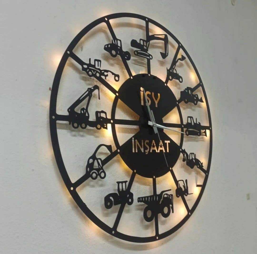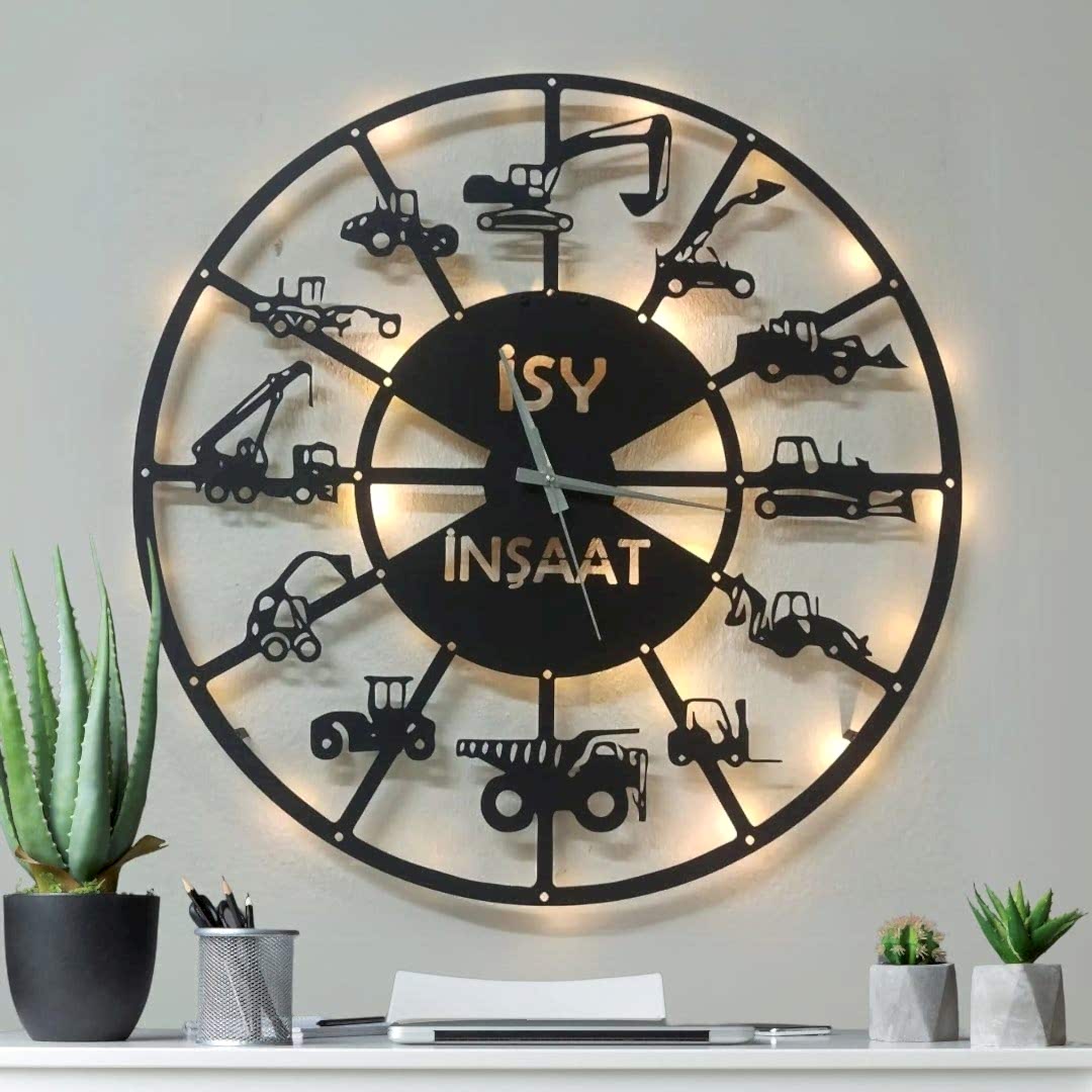 ekskavatör temalı duvar saati, inşaat temalı duvar dekoru, iş makineleri duvar saati, ışıklı iş makinesi saati, kepçe tasarımlı duvar saati, kişiye özel iş makinesi saati, led ışıklı inşaat saati, mühendislik ofisi duvar saati, şantiye dekoratif duvar saati, yapı sektörü duvar saati