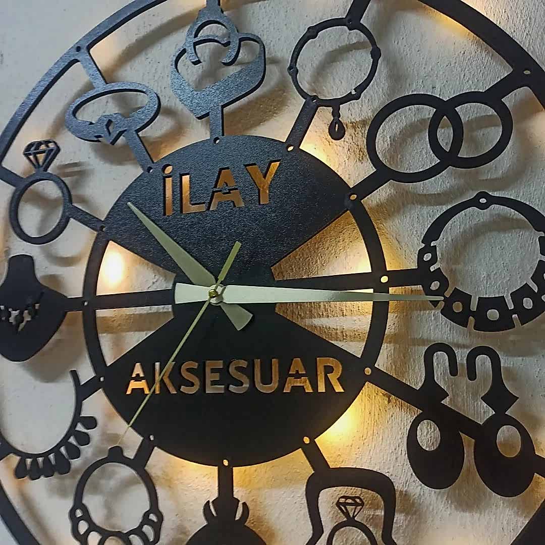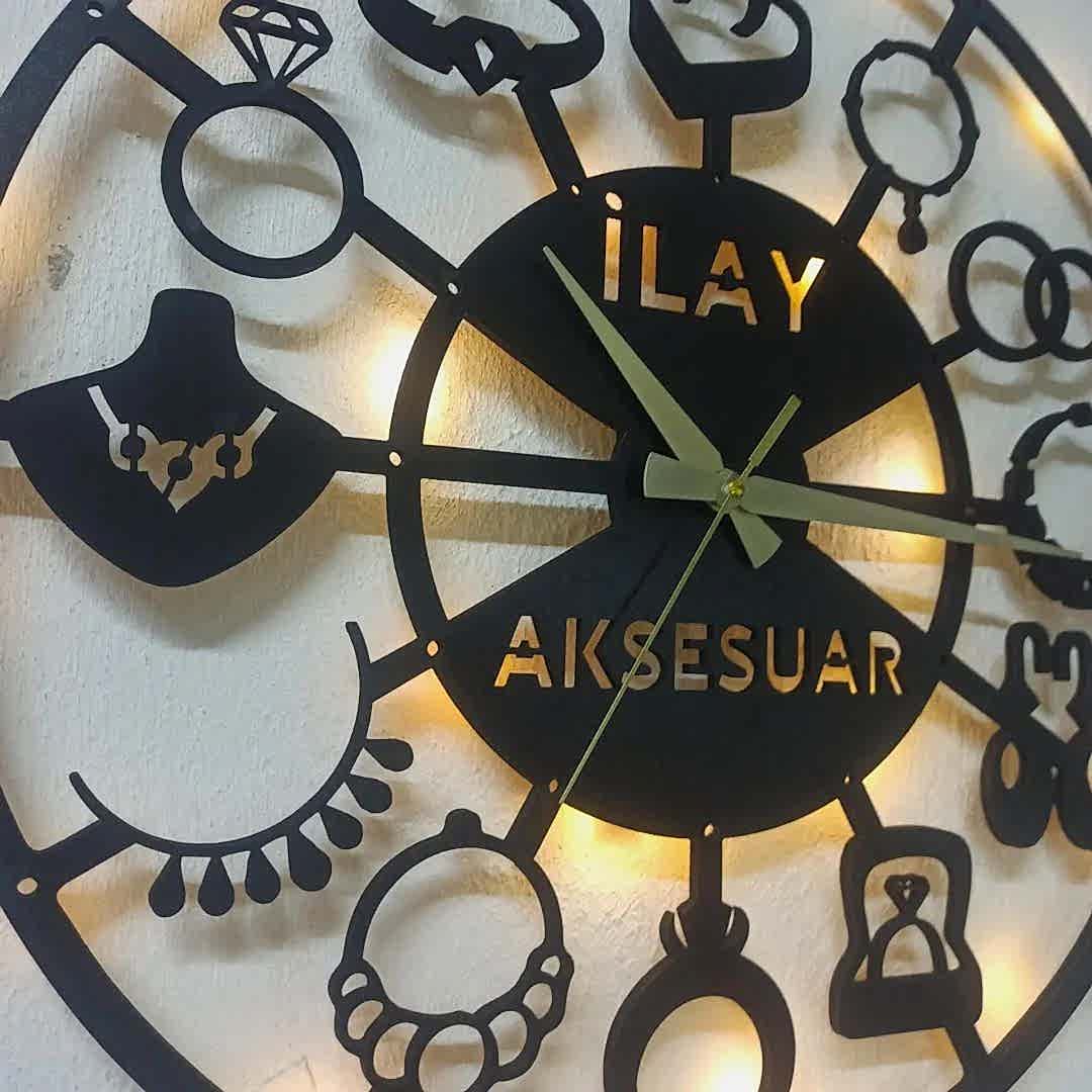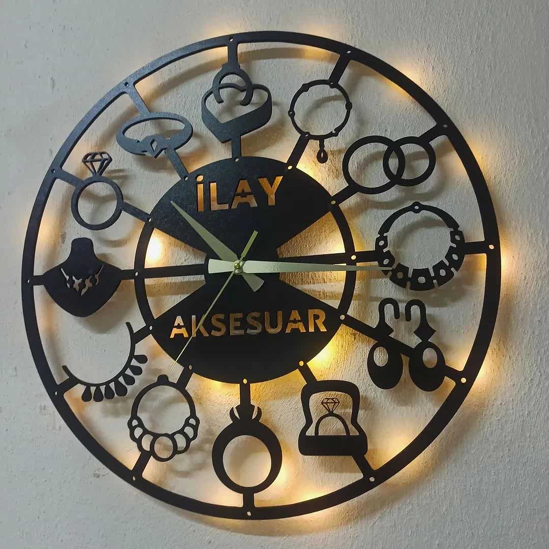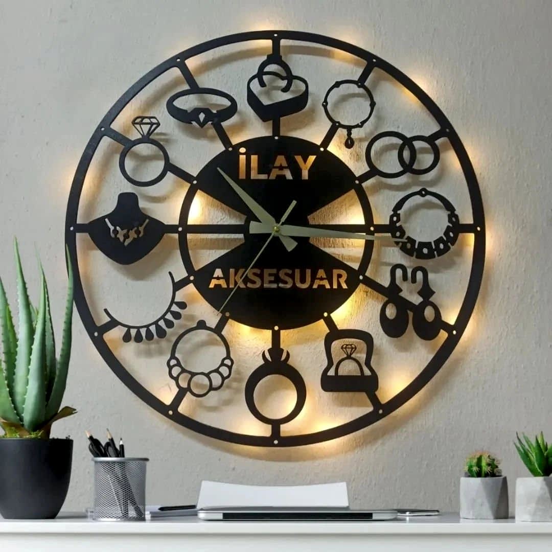 aksesuar mağazası saati, isim yazılı duvar saati, kişiye özel ışıklı duvar saati, kuyumcu duvar saati, LED ışıklı duvar saati, lüks duvar saati, mağaza dekorasyon ürünü, modern dekoratif duvar saati, özel tasarım duvar saati, şık ve modern duvar saati, takı mağazası dekorasyonu, takı ve aksesuar temalı saat