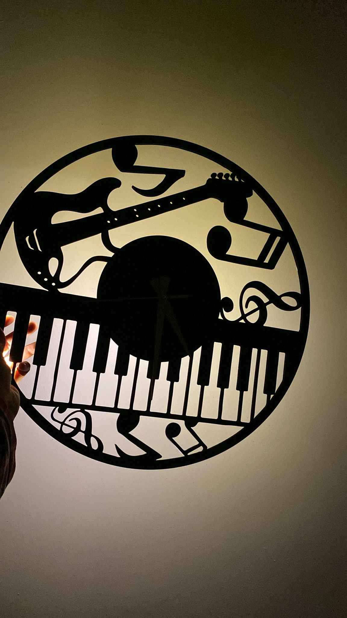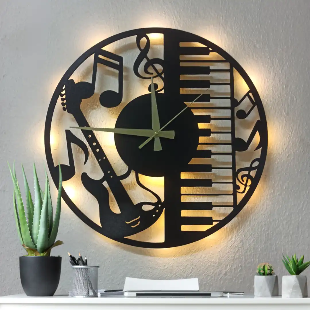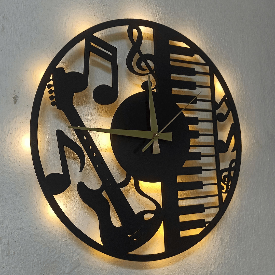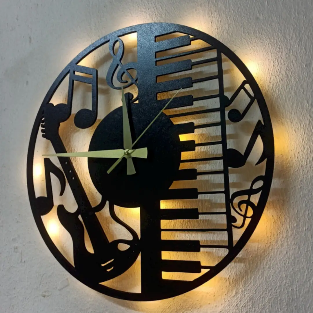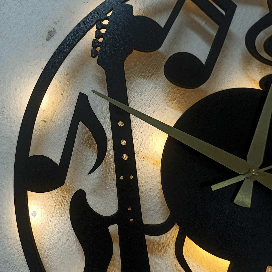 dekoratif müzik duvar saati, enstrüman tasarımlı duvar saati, gitar tasarımlı duvar saati, ışıklı müzik duvar saati, kişiye özel müzik saati, led ışıklı müzik saati, müzik severler için duvar saati, müzik temalı duvar saati, müzisyenler için duvar saati, nota figürlü duvar saati
