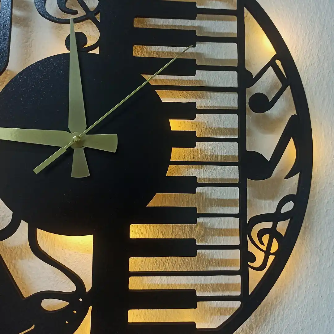 Müzik Temalı Işıklı Duvar Saati, gitar, piyano ve nota detaylarıyla ev ve iş yerlerine sanatsal bir dokunuş katar. LED aydınlatmasıyla göz alıcı bir görünüm sunan bu saat, hem dekoratif hem de işlevsel bir üründür.